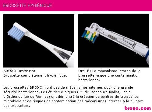 Desde 1960, se han vendido millones de aparatos en el mundo, un éxito sin precedente para este tipo de invento. ¿Y hoy en día? Broxo queda ocultado por numerosos dentistas o farmacias en beneficio de marcas cuyo poder financiero se ha impuesta como la única alternativa creíble. Sin embargo, desde su creación, Broxo es simple y eficiente en la prevención de las enfermedades periodontales (primer cepillo de dientes eléctrico en el mundo en utilizar la cavitación hidrodinámica). Los aparatos Broxo OraBrush y OraJets han demostrado, mediante más de 167 estudios clínicos universitarios y doctorados de estado en medicina y medicina dental, sus capacidades para detener gingivitis en 8 días sin utilizar un método traumatizante y costoso.
