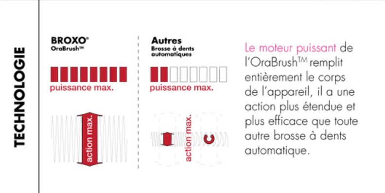 El motor del OraBrush está basado en un imán de tierras raras (Neodimio), mucho más potente y capaz de proporcionar un masaje eficaz de las encías (ver vídeo). A diferencia de otros cepillos eléctricos que incorporan un pequeño motor, el motor del Broxo OraBrush ocupa todo el cuerpo del cepillo. A pesar de su gran potencia, funciona con suavidad y prácticamente sin ruido. Un detalle sensorial importante, ya que un mango que vibra tanto como el cabezal puede resultar incómodo. Mientras que otros competidores simplemente vibran y generan un ruido molesto para algunos, el OraBrush fortalece las encías, logrando una mejora del índice gingival tres veces superior a la de otros cepillos eléctricos.