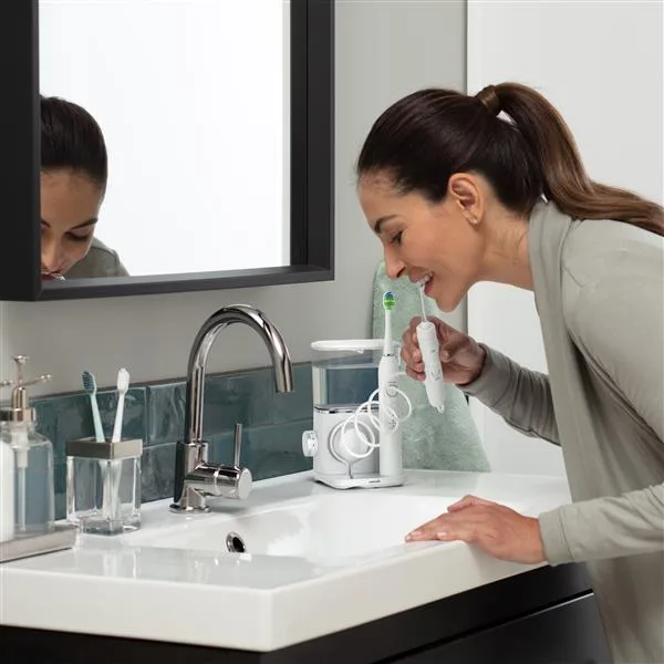 - Sistema de higiene bucodental 2-en-1 : Combina un irrigador dental Waterpik y un cepillo de dientes eléctrico sónico Sensonic en un solo dispositivo para un control personalizado de la higiene oral.